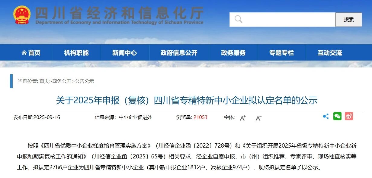 近日,四川省经济和信息化厅公布了2025年申报(复核)四川省专精特新中小企业拟认定名单。四川省数字证书认证管理中心有限公司(...